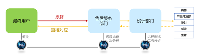 大部分公司的售后技術支持,僅停留在接到故障報修后,通過電話分析可能的原因,然后派人出差的傳統(tǒng)方式。這種方式,由于懂特定產線的技術人員不能及時排班對應,經常導致反應遲鈍。借助于柔性的智能物聯(lián)網平臺uAIoT,我們可以遠程查看產線或設備“過去的數據”,自由地抽取/結合,用適合的方法去可視化數據,來排查可能的原因。如果這樣仍不能找到蛛絲馬跡,我們還可以通過遠程調試的方法,查看“將來的數據”。這樣的立體組合,將大幅加大在即使不派人到現(xiàn)場的情況下,也找到故障原因并施以對策的幾率。這樣既降低了用戶的維護費用,也提高了服務響應的及時性。